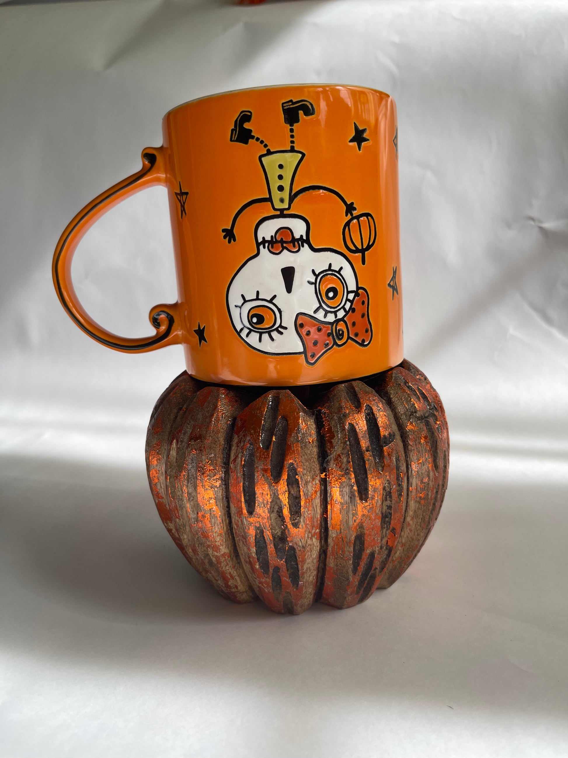 Celebrate the Day of the Dead with this vibrant orange mug! Featuring playful characters inspired by the holiday, it brings a fun and festive spirit to your favorite drinks. Perfect for adding a cheerful touch to your coffee or tea time!