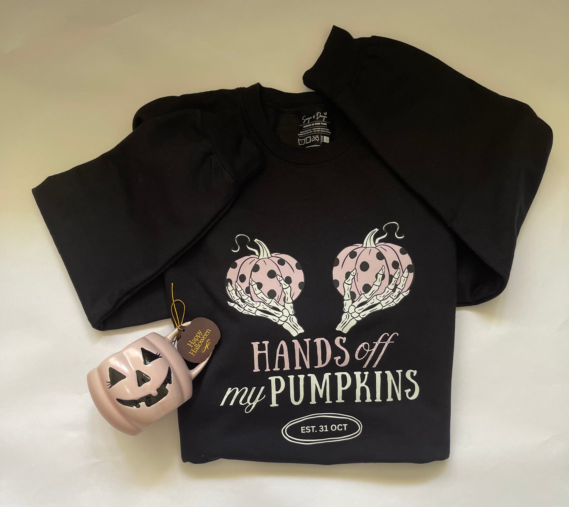 Add a touch of cheeky charm to your fall wardrobe with the Hands Off My Pumpkins Crew Sweatshirt. This cozy black sweatshirt features playful skeleton hands clutching two pink and black polkadot pumpkins, blending spooky and fun in one eye-catching design. Perfect for cozy days with a hint of whimsy, it’s a delightful way to celebrate the season in style.